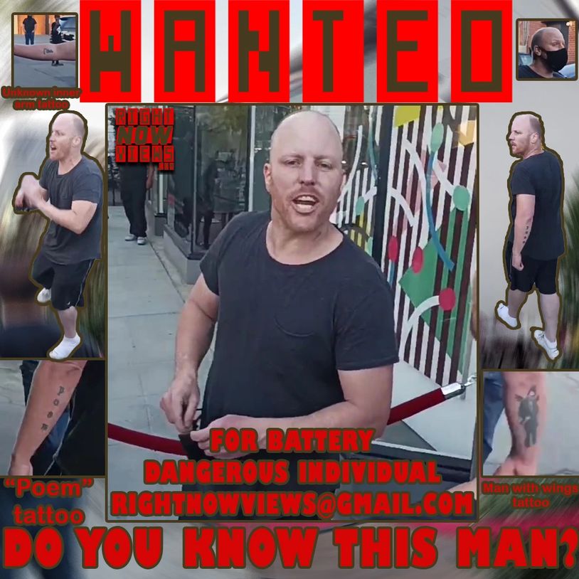 He is on video attacking multiple people outside of Harlowe in West Hollywood, CA on July, 29th. He has a "Poem" tattoo on the back on one arm and another tattoo of a man with wings on the back of his other arm. He also has an unknown tattoo on his inner arm.